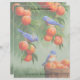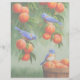 Two western bluebirds perch in a peach tree while a third bluebird sits on a woven wooden basket filled with freshly harvested fruit ready for market. Accented with a matching blue patterned background.