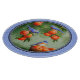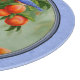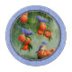 Two western bluebirds perch in a peach tree while a third bluebird sits on a woven wooden basket filled with freshly harvested fruit ready for market. Accented with a matching blue patterned background.