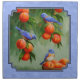 Two western bluebirds perch in a peach tree while a third bluebird sits on a woven wooden basket filled with freshly harvested fruit ready for market. Accented with a matching blue patterned background.