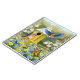 A pair of eastern bluebirds make their home in a cute yellow birdhouse within a beautiful spring garden filled blue and yellow daisies and surrounded by flowering dogwood. Orange and blue butterflies visit the flowers, too. Original artwork created by wildlife artist Crista S. Forest.