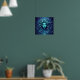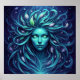 This fantasy poster features a beautiful, blue-haired mermaid with a flowing mane, gazing into the depths of the ocean. Her eyes are glowing with an otherworldly light, and she appears to be surrounded by a swirling vortex of blue and green colors. The mermaid's hair is adorned with leaves, adding a touch of nature to her enchanting appearance. This captivating creature embodies the essence of the ocean and the magic of the sea.