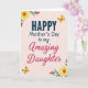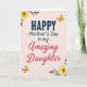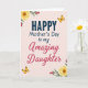 This greeting card features a soft blush background that sets a gentle, affectionate tone for Mother’s Day. In the center, the word “HAPPY” appears first in deep sapphire, large and eye-catching, with the rest of the message stacked beneath it. “Mother’s Day to my” sits below in a thinner, flowing style in a darker neutral shade, followed by “Amazing Daughter” in a rich crimson, giving the line a tender, close-to-the-heart emphasis ❤️. The lettering feels like it’s arranged to guide your eyes downward in a calm rhythm, like a warm note being read aloud. In opposite corners, yellow blossoms with orange-brown centers open toward the text, with slim green leaves and a few rose-pink buds adding a soft, caring touch 🌼. Two small golden-winged insects hover near diagonal corners, their delicate bodies and patterned wings echoing the lightness of the floral details. The corner flowers show layered petals with a softly brushed look, and the insects are trimmed in warm gold against the blush backdrop.