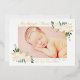 This elegant photo birth announcement card introduces your beautiful baby girl with a newborn photo and stylish real gold foil text that can be personalized to feature your baby's name in script, along with important birth information, and parent names. The photo is accented with a floral peony and woodland greenery watercolor design in cream, gold, blush, peach, and green colors. A pattern of white horizontal stripes dresses up the back of the card. The blush peach / pink background color can be modified.