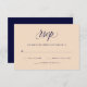 These simple and minimal wedding RSVP cards feature navy blue calligraphy on a blush pink background.