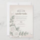 Set the tone for a beautiful celebration with this bridal shower invitation, designed on a muted blush-beige watercolor background. Delicate white roses with flowing eucalyptus branches, while gentle scattered petals enhance the elegant style. The layout includes editable text for your event details, making it simple to personalize. A refined and timeless design, perfect for brides who love understated floral elegance.