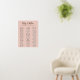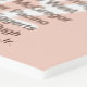 Blush pink seating chart with brown fonts where your guests are written by the table number atop the table number in a white script. 12 seats seating chart for a wedding or any other event with eight guests per table with the bride and groom's names at the top in a charming brush script along with date and venue beneath.