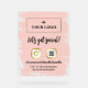 Acrylic let's get social sign with your logo and QR code printed on blush pink printed paint hastily brushed over the acrylic surface with faux gold foil details your hashtags and your social media handle. Social media promotional sign with black fonts and blush pink paint strokes printed on an acrylic background personalized with your QR code and social media handle so your clients and customers can easily access your social media as well as your business logo. Blush pink acrylic social media sign for your salon or small business for promotional purposes to help your customers and clients find you online by scanning your QR code.