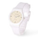 I only have one complaint. I ordered the watch with clear case and strap, and what was sent was white case and strap. I'm going to keep it because 1) it looks very nice in white, and 2) it would take too long to get a replacement made and sent in time for my occasion. Aside from the mix up with the color, the watch does look very good in white. The purple dial is actually sparkly which did not show in the online images. That was a nice surprise. If you like Swatch watches this is very similar to those. It's 33.6mm in diameter, 10.5mm thick, and 40.6mm lug to lug. Stainless steel case back says 3ATM/30m WR, so no swimming or showering or submerging this one. If you like Woodstock, this is a great choice.