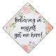 This Blush Floral and Script Inspiration Message Graduation Cap Topper is the perfect way to let the graduate stand out at his or her graduation ceremony. This design features a Blush Floral and Script Inspiration Message. Believing in myself got me here is featured in black script font on the center of the cap topper. Graduation is a special day and this cap topper will make the day even more special. Use cap topper as a great photo prop or a keep sake from the special day.