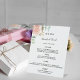 A chic white background. Decorated with blush, rose gold floral, rose and green watercolored eucalyptus leaves, sprigs, greenery. Add your names and dinner menu.