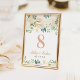 Woodsy romantic style wedding table number cards feature numbers framed by a floral watercolor wreath with painted roses, ranunculus flowers, and leaves. Color scheme includes neutral shades of white, cream, blush pink, gold, and green. Perfect for a spring or summer event.