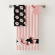 Chic bath towel set done in blush and black, with stripes and lovely graphics of blush colored magnolia blooms. This lovely statement bath towel set has matching home decor available.