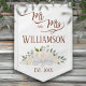 This pennant flag is beautiful, stylish, and fun. Designed to celebrate the newlyweds, it features an elegant boho chic design with a cluster of hand painted watercolor roses and blossoms in shades of champagne blush or very pale peach. The elegant script text reads: Mr. and Mrs. with the couple's last name as well as a cute "established" spot for the wedding year. Wonderful as decor for the wedding reception, or as a gift for the new couple.