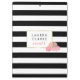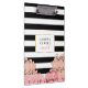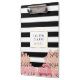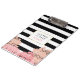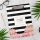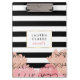 Chic personalized clipboard features a black stripe background, faux gold border, and a group of peonies in pretty blush tones with your name, company name or choice of personalization in the center. Design repeats on reverse side.