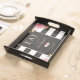 Elegant black and white striped floral wedding serving tray featuring blush pink and ivory flowers and gilded greenery. Matching items available.