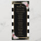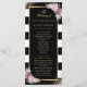 Elegant black and white striped floral wedding program featuring blush pink flowers and greenery framing the wedding details inside a gold frame against a black and white background adorned with gold confetti. Matching items available.