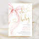 Blush Pink Bow Elegant girl baby shower invitation. Modern minimalist design in blush pink and gold. Features trendy watercolor coquette bow, and heart script font Oh Baby. Perfect for an elegant style girl shower celebration. Personalize with your own details. Printed Zazzle invitations or instant download digital printable template.
