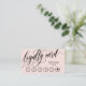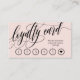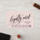 A chic and eye-catching loyalty card for a makeup artist, nail artist, beautician, lash artist, or similar with loyalty card written in a gorgeous black calligraphy script, rich with swirls, against a pale pink background. Six punch hole markers, with a black heart in the sixth one.