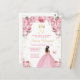 This elegant and glamorous birthday party invitation features a beautiful princess with dark skin in a blush pink ball gown. The text combines handwritten script and modern sans serif fonts for a classy and sophisticated look. The floral arrangements, butterfly and gold confetti create the perfect blend of rustic and chic.