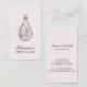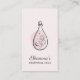 On a light blush pink background is a line art drawing of an essential oils bottle decorated with moon, stars, and a pretty flower. With its calm, feminine color palette, this business card design was created for an aromatherapy or healing arts business. All example text on front and back of the card can be easily revised with your own details on the personalization template.