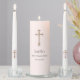 Personalized First Holy Communion Candles featuring blush pink background and gold crucifix. .