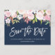 blush pink floral navy blue save the date postcard