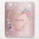 A blush pink metallic looking background. Faux silver glitter dust as decoration. A golden heart decorated with pink flowers. Personalize and add a name. The name is written a modern hand lettered script.