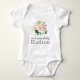 A sweet design for a newborn, this custom baby bodysuit has a floral bouquet of watercolor roses and eucalyptus and trailing greenery in soft blush pink, white, green and blue-green. The text template includes a pairing of handwritten script and serif type faces. Designed for a baby girl, the text may be personalized with any name. Shown here in the newborn size, other sizes are available.