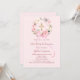 Blush pink background, decorated with watercolored pink and white flowers in a wreath and a golden cross. A pink bow. Personalize and add a name and details.