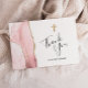 This elegant modern First Communion thank you card features a blush pink watercolor agate border trimmed with gold faux glitter. A small gold faux foil cross appears over the words "Thank You" in charcoal gray handwriting script on a white background. The customizable text includes your child's name on the front and an editable message on the back in italics. Ideal for a girl's First Communion.