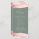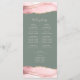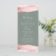 This elegant, modern wedding program features blush pink watercolor agate top and bottom borders trimmed with gold faux glitter. The text appears in elegant blush handwriting and copperplate fonts on a sage green background.