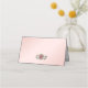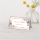 Elegant blush pink and gold floral wedding table card or place card featuring blush pink flowers and greenery framing the guest name and table number inside a gold frame. Matching items available.