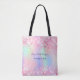 A trendy holographic background with unicorn colors and rainbow colors in pink, purple, mint green. Decorated with pink confetti. Personalize and add your name, title.