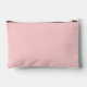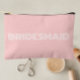 Solid blush pink color, small style, zippered cosmetic bag for your wedding bridesmaid that features the word, BRIDESMAID in large, modern typography on one side of bag. Perfect as a travel accessory pouch to hold makeup, perfume, and jewelry. You may personalize by adding bridesmaid name if desired to pouch. Available in many, popular bridesmaid wedding color schemes.