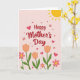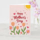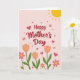 This card features a soft blush-pink background with the words “Happy Mother’s Day” centered near the top in flowing crimson lettering. Below the greeting, the layout leads your eye into a garden scene that feels like a gentle hug, with flowers leaning toward one another as if sharing quiet affection ❤️. In the lower third, orange tulip-like blooms with closed petals sit among bright fuchsia flowers with sunny yellow centers, creating a cozy, friendly contrast. Green stems and leaves spread outward to frame the bouquet, giving the arrangement a grounded, natural look. Small red hearts float above the flowers, adding a romantic touch without crowding the space. A couple of tiny butterflies hover nearby, their light wings suggesting a sweet, caring closeness 🌼. In the upper right corner, a golden segmented sun with short rays shines over the scene.