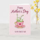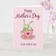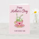 Designed with a soft pastel look, the card centers on a blush-pink teacup and saucer that feel cozy and inviting. Fine gold details trace the rim and curved handle, catching the light like a cherished keepsake. Nestled inside the cup is a small bouquet of leafy green stems and white, bell-shaped flowers, arranged like a gentle gift between close hearts ❤️. A bright red heart emblem sits on the side of the teacup, standing out against the pale ceramic and adding a romantic touch. Near the top, a flowing greeting appears in rich magenta lettering, arcing above the illustration. Beneath the cup, a smaller line of text in a darker tone is placed neatly to read as a quiet dedication, balanced with plenty of open space 🌼. The background stays light and airy, with softly diffused shading around the cup, the red heart emblem, and the white blossoms.