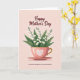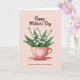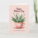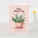 Designed with a soothing blush-pink background, this illustration centers on a rose-toned teacup holding delicate, bell-shaped white blossoms and fresh green leaves that lean toward each other like close friends ❤️. The cup has a shiny gold rim and curved handle, and it sits on a matching saucer edged with a thin gold ring. On the front of the teacup, a detailed white heart pattern adds a gentle, romantic touch without needing any characters. Near the top of the card, a flowing message appears in warm crimson lettering, arcing above the flowers. Under the cup, a shorter line of text is set in a classic serif style, smaller and neatly aligned, as if signed with care 👩. Soft, diffused lighting keeps the whites bright and the greens fresh while the gold accents catch the eye. The white blossoms rise from the cup’s center, with a few tiny bell shapes pointing slightly left against the pink field.