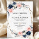Bring a touch of modern romance to your big day with this blush and navy blue floral wedding invitation. Soft blush roses and deep navy blooms are beautifully arranged around an elegant gold geometric frame, adding a fresh, stylish feel. This design works perfectly for garden weddings, vineyard ceremonies, or any celebration that blends timeless florals with a modern edge. Your guests will love receiving an invitation that feels both classic and contemporary, setting the tone for your unforgettable day.