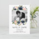 Elegant Blush pink / peach, navy blue spring floral botanical wedding photo save the date card featuring a bouquet of soft pastel watercolor roses, peonies and hydrangeas in shades of blush pink, peach and cream with lush green botanical leaves and eucalyptus leaves. A modern design choice that is perfect for spring and summer sage blush pink themed weddings.Please find more matching designs and variations from my "blissweddingpaperie" store. And feel free to contact me for further customization or matching items.