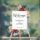 This acrylic welcome sign for guests at a wedding features an elegant floral border with blush pink, peach, coral flowers, and green foliage. The central text warmly greets guests with “Welcome to our wedding, indicating the couple’s names and the date of their special day. This personalized sign is typically placed on an easel at the entrance of the wedding venue, setting a beautiful and inviting tone for the celebration.