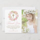 Blush Pink Peonies Wreath First Holy Communion Thank You Card. Customizable photo thank you flat card featuring pink watercolor peonies and roses with foliage, twigs and baby's breath accent. This floral photo thank you card will also be perfect for Baptism and Christening thank you card.