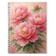 This elegant notebook features a painterly illustration of blooming pink peonies rendered in a soft, textured oil-painting style. Lush petals in shades of blush, coral, and rose surround golden centers, complemented by deep green leaves and a gentle pastel background. The expressive brushstrokes and layered texture create a romantic, serene aesthetic, making this notebook perfect for journaling, note-taking, or gifting to floral and art lovers.