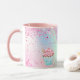 A trendy holographic, iridescent background with unicorn colors and rainbow colors in pink, purple, mint green. Decorated with confetti in pink and 3 cupcakes. Personalize and add your name. The name is written with a modern hand lettered style script with swashes.