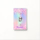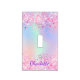 Rainbow, holographic background in pink, purple and mint green. Decorated with confetti. Personalize and add a name, purple colored letters. The name is written with a modern hand lettered style script.