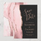 The left-hand edge of this elegant modern wedding save the date card features a blush pink watercolor agate border trimmed with faux rose gold glitter. The customizable text combines rose pink handwriting, copperplate and italic fonts on an off-black background. The reverse side repeats the blush agate design.