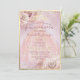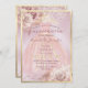 This enchanting custom invitation features a blush pink and gold colored quinceañera theme. A glamorous ball gown dress is placed in the center, over a soft pink background. A gold faux foil tiara rests above the dress, with a matching gold frame. Bouquets of blush roses accent the corners, and pink glitter is sprinkled across the top and bottom portions.