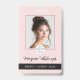 Blush pink and black employee badge with modern typography and elegant script includes a photo, qr code and add your own logo. Quickly send clients to reviews pages, price lists or landing pages with a qr code on your badges. Message the designer for further customization.