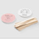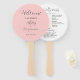Wedding day program printed on a round style hand fan that features a trendy blush pink color background on the front side with the bride and groom names in dark gray, stylized script. Back side of program lists the wedding party participants and ceremony rites on a white background with dark gray lettering. Edit hand fan and replace wedding program info with your own. Perfect for an indoor or outdoor wedding ceremony! Select number of hand fan programs desired.