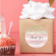 Round sticker for baby shower favor with faux gold glitter and blush pink stripes background.