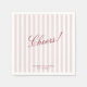 Modern wedding napkins featuring blush pink and white vertical stripes with elegant red script reading “Cheers!”. Perfect for cocktail hour, dinner service, or the bar, these stylish napkins add a chic and personalized touch to your wedding celebration. A simple yet elegant design that complements a modern striped aesthetic.